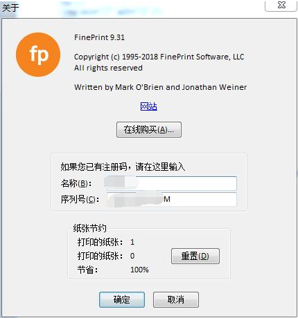 2、弹出了如下的FinePrint界面并附带注册窗口,若未弹出注册窗口,请点击“设置-关于”,然后输入序列号和名称,名称任意输入,输入序列号。