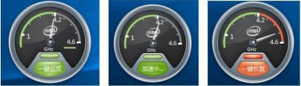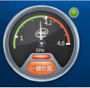 3、点击一键超频按钮,执行CPU超频操作,超频成功后,灰色部分会变成橙色,表示CPU能到达新增的频率范围。如下面图中所示,CPU 一键超频后频率指针可以从4.2G Hz摆动到4.5G Hz。点击一键恢复按钮,CPU 会恢复到超频前状态;
