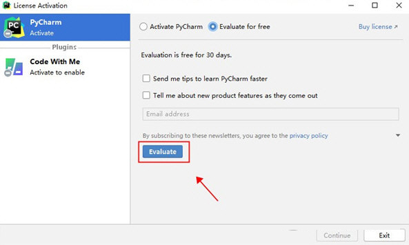 5、启动软件,弹出注册界面,选择evaluate for free,点击evaluate试用软件。