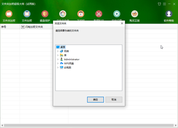 1、打开文件夹加密超级大师,点击“文件夹加密”。选择需要加密的文件夹后点击“确定”。