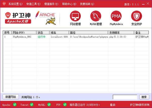 护卫神Apache建站大师官方版是一款非常不错的主机管理软件,护卫神Apache建站大师官方版界面简洁美观,功能实用,拥有系统设置,快捷工具,增值服务,帮助中心等选项,使用起来方便快捷。