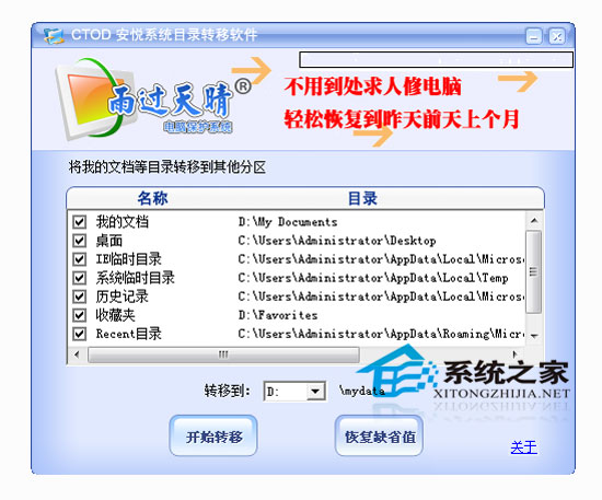 安悦系统目录转移软件下载Windows在安装时缺省把我的文档、桌面等目录放到C盘,这很容易造成C盘空间不足,这时您可以使用本软件将保存于C盘中的我的文档、桌面、IE临时目录、Outlook邮件目录、系统临时目录中的资料转移到其他分区中,以减轻C盘空间压力。 如果您安装了雨过天晴电脑保护系统,只保护C盘,那么在您恢复C盘的时候不会恢复我的文档、桌面、Outlook邮件,不会造成数据丢失。 原版运行就弹出安悦公司主页,应朋友要求仓促把广告去了,顺便发在这里,有用的上的可以试试。
