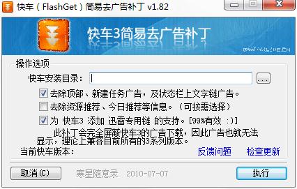 快车简易去广告补丁是快车FlashGet的补丁,能自动识别快车安装路径,能够去除大多数广告,体积小巧,使用方便,理论上支持后续版本,推荐使用极度精简模式,完全的去掉了广告,也不会再影响菜单的显示了,影响就是车库等功能无法使用了。当然,这个选项提供了还原功能,其他选项因为用途不大,不提供还原功能,需要还原可以重新安装程序即可。