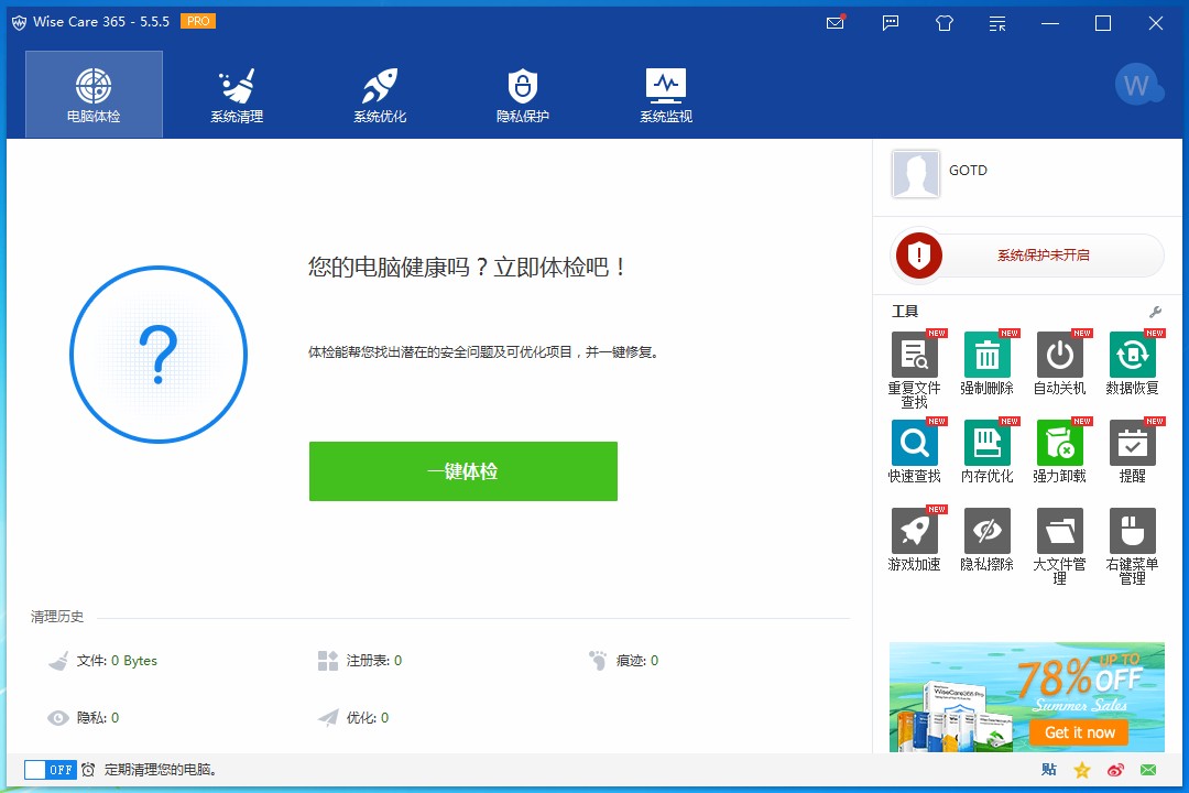 Wise Care 365是一个专业的系统优化软件,功能与360安全卫士类似,但运行速度明显比以前更快,并专注于系统优化,它将著名的智者磁盘清洁和磁盘清理工具注册表注册表清理工具清洁合二为一,全面提高计算机的性能。