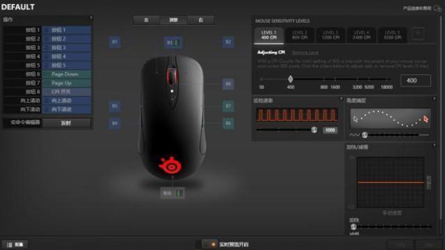 整个鼠标拥有8枚按键,其中左、右侧裙各设计有2枚,当然是可以用大家熟知的赛睿自家的SSE3软件来进行相应的设置即可,支持全部8颗按键的自定义,并提供有5组板载存储,可用来保存玩家喜欢的CPI、回报率等参数,方便在不同的电脑上使用。
