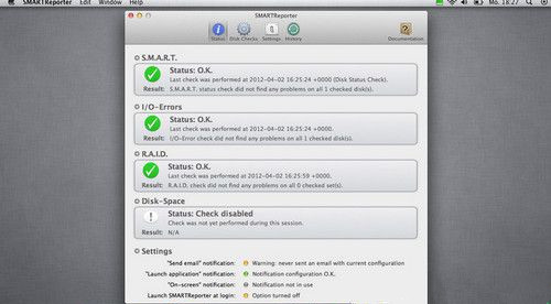 SMARTReporter是一个应用程序,可以在某些实际发生的硬盘驱动器故障之前警告您!通过定期轮询硬盘驱动器的内置SMART状态以及对“ I / O错误”或RAID“降级”执行其他检查来做到这一点。硬盘驱动器的当前状态始终易于识别,因为如果发生问题,SMARTReporter的图标(可以在菜单栏中)从绿色更改为红色。