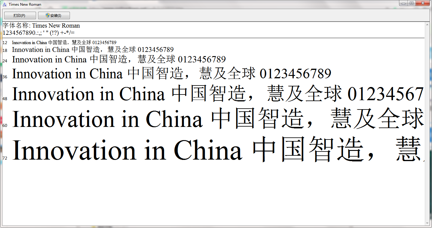 Times New Roman是一种广泛使用的字体,属于过渡衬线体。截线如被切割般平整、纤细、末端矩形,字母宽度差别较小,显得四平八稳,应用范围广泛。Times NewRoman笔画比Garamond稍粗,粗细变化也较Garamond小,Times NewRoman显示小字时易读性仍然很高,作为标题就不那么醒目了。