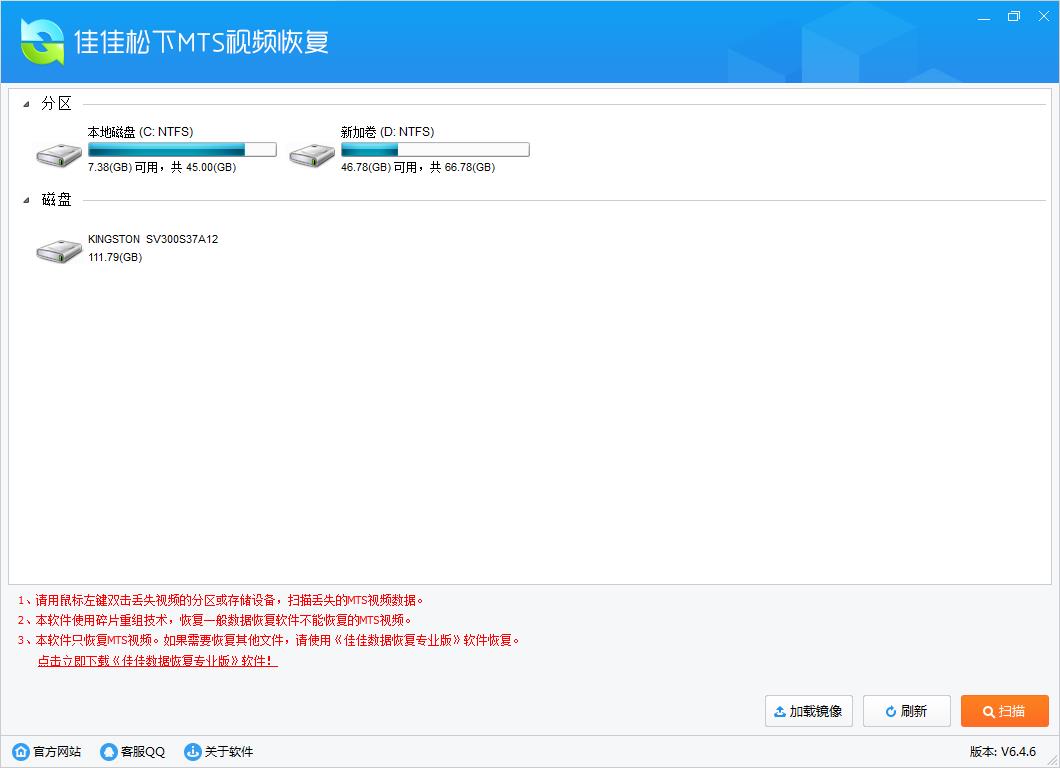 佳佳松下MTS视频恢复软件是一款简单实用,功能强大的MTS视频恢复工具。软件支持恢复松下单反/微单相机、摄像机拍摄的MTS格式的影像视频,同时还可以完美支持目前松下相机所有型号。