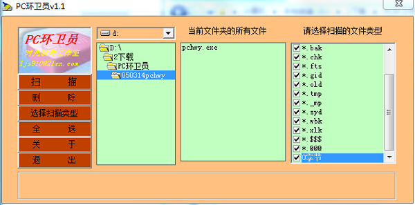 PC环卫员是一款小巧实用的专业化电脑垃圾清理工具,该软件能帮你扫描电脑中的垃圾文件,而且可以全选删除,效率非常高,功能强劲,绿色免费,能够帮助用户轻松清除掉电脑使用过程中产生的垃圾文件,相当的实用,不用不知道,一用吓一跳,第一次使用,会帮你找出上千个垃圾文件。