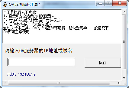 通过执行这款OA IE初始化工具,OA的IE端基础环境将一键设置完毕,一般情况下OA即可正常使用。