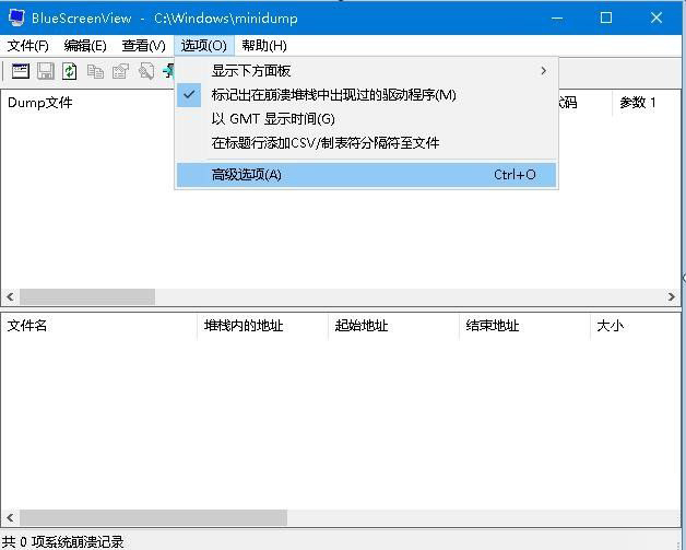 4、只要在高级选项中选择正确的转储文件夹,BlueScreenView也可以让你在另一个Windows中查看崩溃数据。在“选项”菜单中,选择“高级选项”,然后就可以从指定路径加载其他转储文件(如从其他计算机复制)进行分析