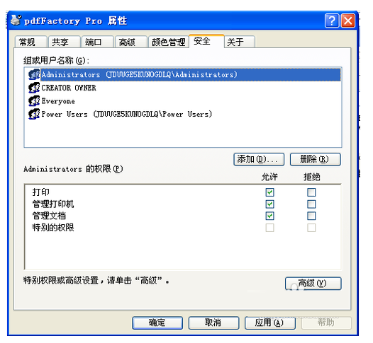 5、然后单击确定就可以共享了,当然我们还可以做一些其他的设置,我们还可以为该虚拟打印机设置权限,比如设置那些用户可以访问;
