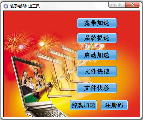 感恩电脑加速工具是一款多功能的电脑加速器,它集合了宽带加速、系统提速、启动加速、游戏加速和文件快搜、文件快移多种功能,是帮助用户电脑加速的必备工具。