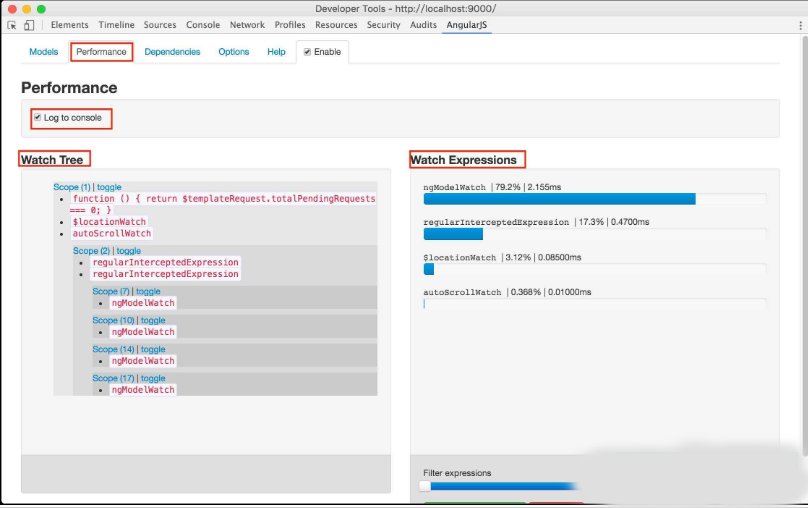 6、Performace展示的是该应用的性能,左侧显示的是监控树,点击树的节点,跳转至相应的element元素上。右侧显示的是监控表达式的性能,这个页面能帮助我们进行性能优化。