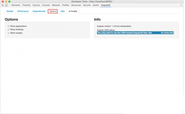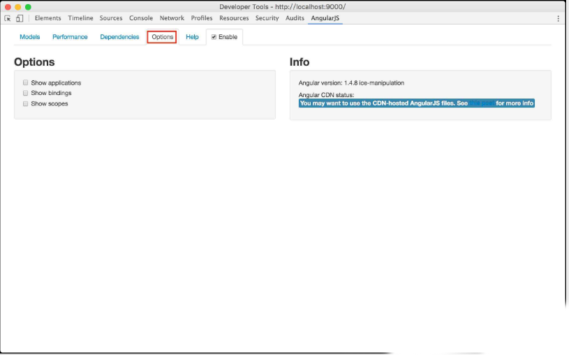 8、最后是options页面。有三个选项:”show applications,” “show scopes,” 和 “show bindings.”。每个选项勾选时,在debugger时,相应的内容会在页面高亮。