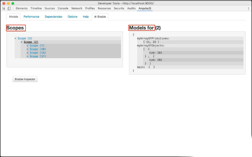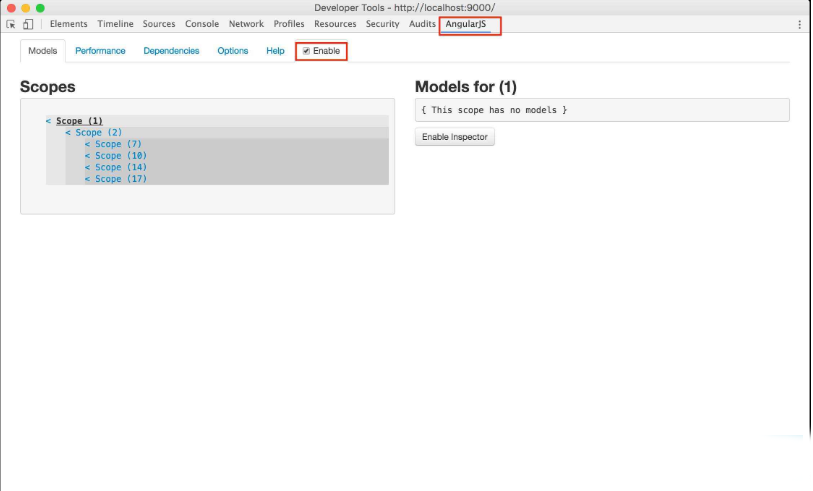 4、在chrome浏览器中打开一个Angular应用,并打开控制台,如下图,会发现控制台中多了一个AngularJS的页面,勾选“Enable”,该控件就可以使用了。