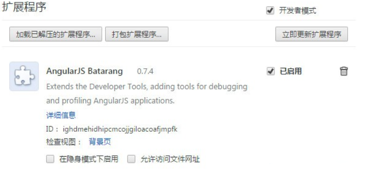 1、AngularJS Batarang插件离线安装的方法参照一下方法:老版本chrome浏览器,首先在标签页输入【chrome://extensions/】进入chrome扩展程序,解压你在本站下载的插件,并拖入扩展程序页即可。