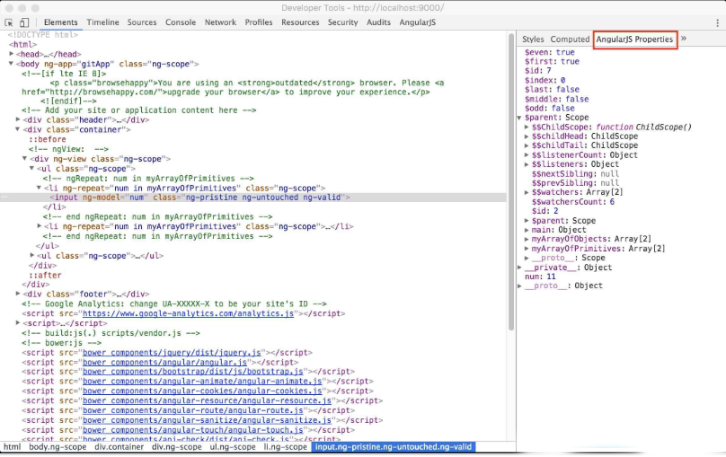 10、在Element标签中选定某个标签时,Element页面的右侧的内容,会多一个AngularJS Properties页面,该页面显示的是选定的html内容的作用域的属性,该功能对于对Angular Scope的理解非常有用。如果不是很理解Angular Scope,可以多用一个这个功能。