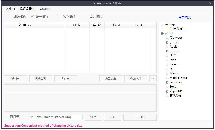 该版本基于ShanaEncoder新版4.9程序汉化,由果核剥壳绿化分享,无需安装,解压后可直接使用,打开即为中文版本,功能上没有限制,也没有任何缩减。