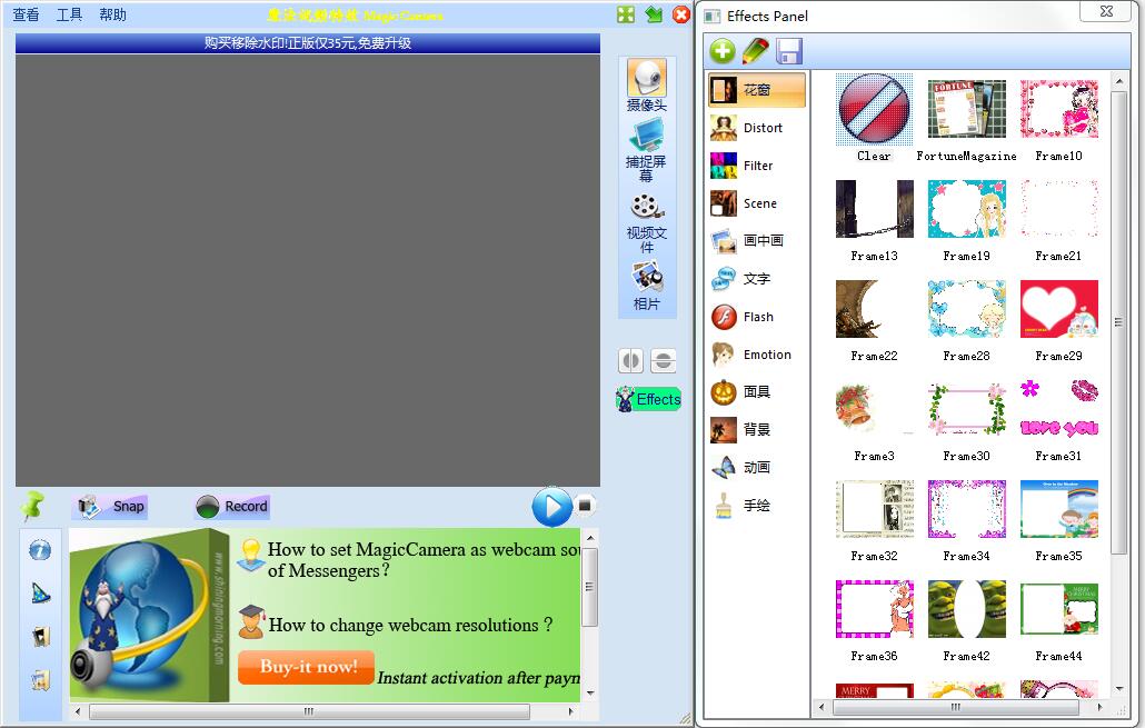 魔法视频特效是一款很酷的虚拟摄像头软件。它可以为您的摄像头增加视频特效,从而很轻松的做出很多摄像头视频的魔幻效果,同时,它还是一个虚拟的软件摄像头,可以把视频文件,屏幕,图片,flash等做为虚拟摄像头的输出,配合摄像头软件,如Skype, QQ等或视频网站使用。
