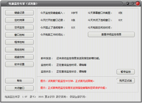 电脑监控专家是一款功能强大、简单易用的电脑监控软件。它可以记录所有的键盘输入(如聊天记录等)和屏幕显示以及打开窗口的标题和时间。你还可以禁止打开指定的窗口和程序、禁止运行聊天软件(QQ,MSN等),下载软件(迅雷、BT等)和游戏软件等。如果尝试打开或运行这些被你禁止的窗口和程序会被立即关闭并记录下来。另外,软件还可以把所有监控的信息(键盘输入记录,屏幕截图,活动窗口记录和违规记录等)发送到你指定的邮箱,让你轻松实现网络监控。本软件安装后,不留任何痕迹,并且采用热键启动的办法,让你在神不知,鬼不觉的情况下监控你想监控的电脑。