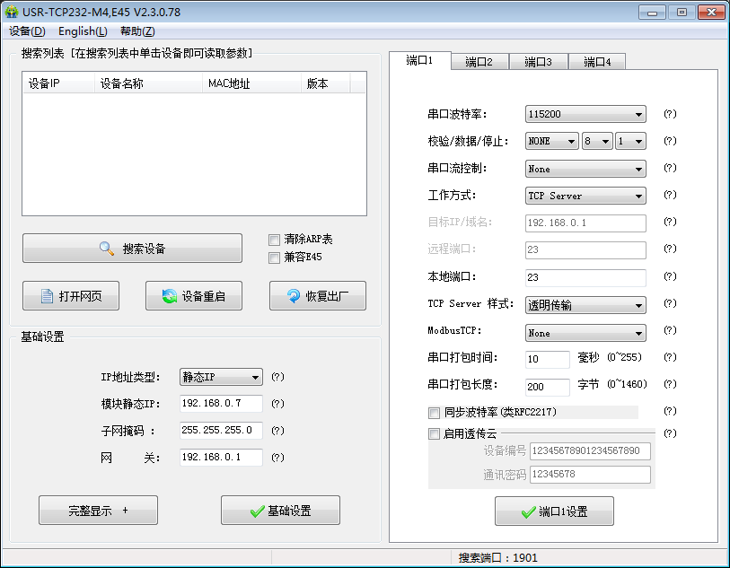 本软件适用于TCP232-E45系列:USR-TCP232-E,USR-TCP232-ED,USR-TCP232-401,USR-TCP232-504,USR-TCP232-500,USR-TCP232-52E,USR-TCP232-52PE